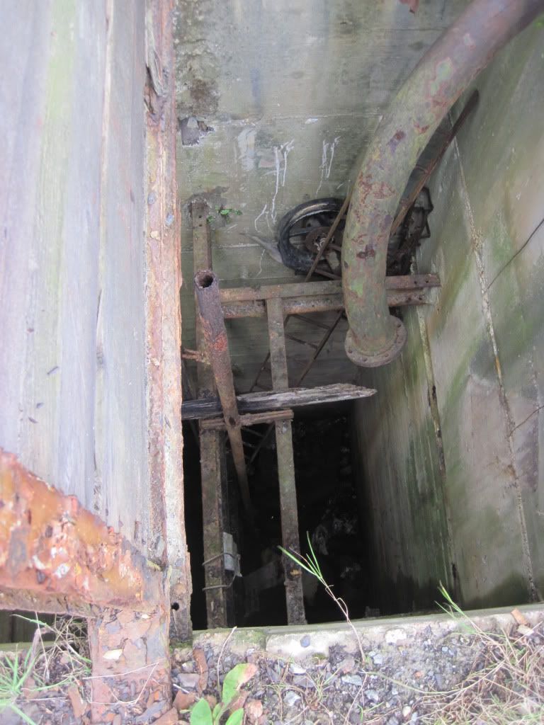 The shaft was 10ft square with a concrete collar for about the first 10ft or so. It was an easy drop in the skiproad with no bad air or obstacles. The North East side of the shaft was for the pitwork (left) and the footway (right) The SW of the shaft was solely for the skip which had been slung down a couple of years ago. The shaft is divided into 2 by a series of 4x10" (approx) timbers which are concreted in and are used to support 2 big iron rails in the skip section and the gubbins for the pipes/footway.