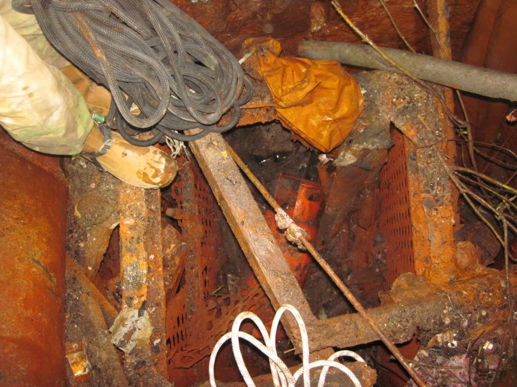 We found the cage under a tyre and a couple of gas cylinders. There was a lot of crap at this level -120ft and we could see water about another 8ft down. We couldn't tell if there was a level. Oddly enough the air was very clear down there which I wasn't expecting with a blind shaft. The only way to tell is to heave out some of the crap.