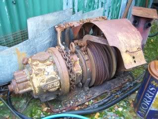 it would appear to be the outside casing of a winch, the outer case would have turned when power was fed to it and when the brake was applied, power would be transfered via planetry gears and a shaft. This setup is used on double drum winches where a return cable is required, one drum turns the opposite way to the other