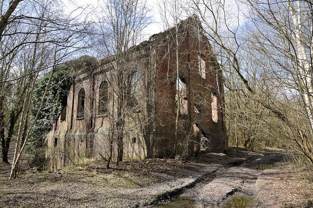 The large horizontal steam winding engine house built in 1896. The track bed of the hill top spur runs in front of the building leading towards the site of the loco shed and top of the incline.