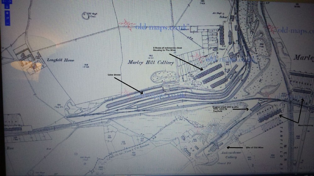 Marley Hill Colliery (re opened 1841 (abandoned 1815) closed 1983) and Andrews House (lower Right opened 1843, closed 1920) Showing The Bowes Railway cutting through the centre (West to Byermoor - Hobson (Burnopfield) -Dipton - Pontop. East to Kibblesworth, Springwell ) The huge amount of Coke Ovens Dominates the map (All 330 of them) which also dwarfs the Mine. note how close the Housing is to all the activity which appears to be located within the Pit Yard, including a School (near an Air Shaft) and Chapel (top right) Whilst Andrews House looks a tiny concern (Both owned by John Bowes)