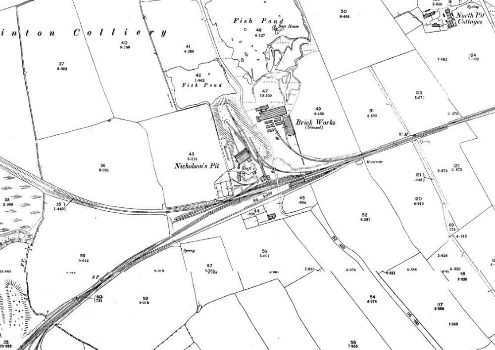 The Nicholson Pit was part of the Rainton Group of mines, http://www.dmm.org.uk/colliery/n023.htm opened 1817 but marked disused by 1919 map, somehow the shafts are still in situ, marked pumping engine/station from 1939 map. To the right of the map not in view was a very large Haulage engine, whilst the line itself split in two with one line heading off to Seaham Docks crossing over the famous Copt Hill line from Hetton-Le-Hole, whilst the other lines continued off to the North Hetton Mines (Hazard/Moosley), the line to the left led onto the just in view Meadows Pit (now a lake after Open Cast works).