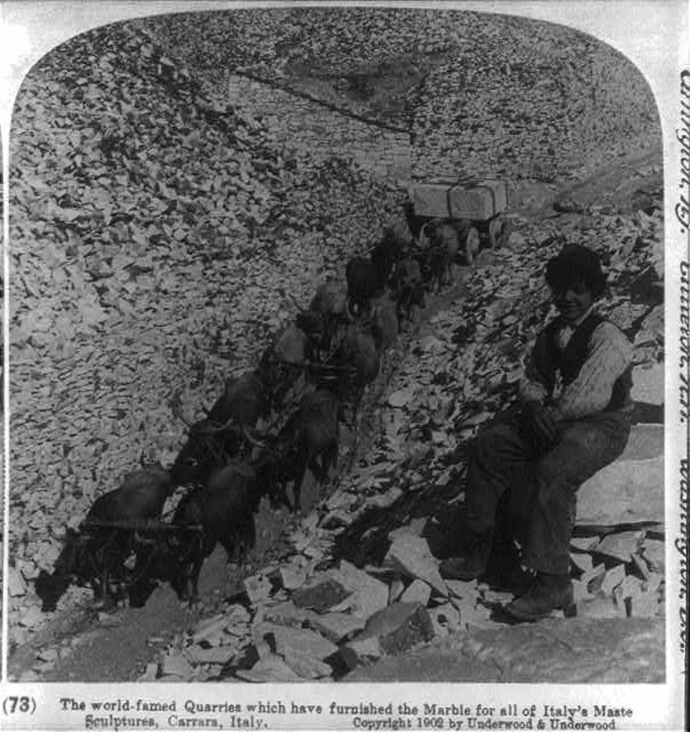 Boy seated atop quarry in foregrd.; large block of marble on ox-drawn wagon below