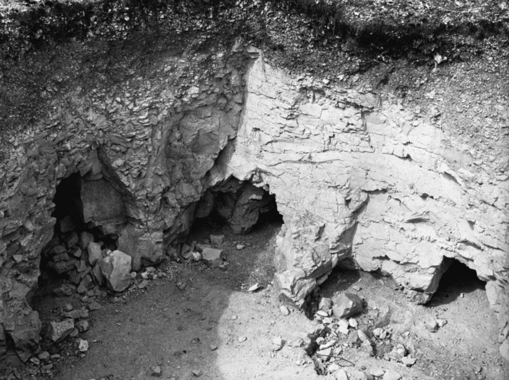 Black Patch Hill, about 1 1/2 m. WNW of Findon. Looking N. Neolithic flint-mine. North side of the shaft (about 10 feet deep) and three of the eight radial headings of the first mine reopened by J.H. Pull, of Worthing in 1922-23. As far as possible, the original surfaces, bearing marks of antler-picks and drifts, have been preserved. The excavation is in the Actinocamax quadratus Zone of the Chalk. Flints are infrequent; the only definite course encountered is one of widely-spaced, flattish, free-flaking nodules about level with the floor of the working, along which, it will be noticed, the sides of the heading have been undercut. In two or three cases the headings connect with others driven from adjacent shafts of the Black Patch mining field.