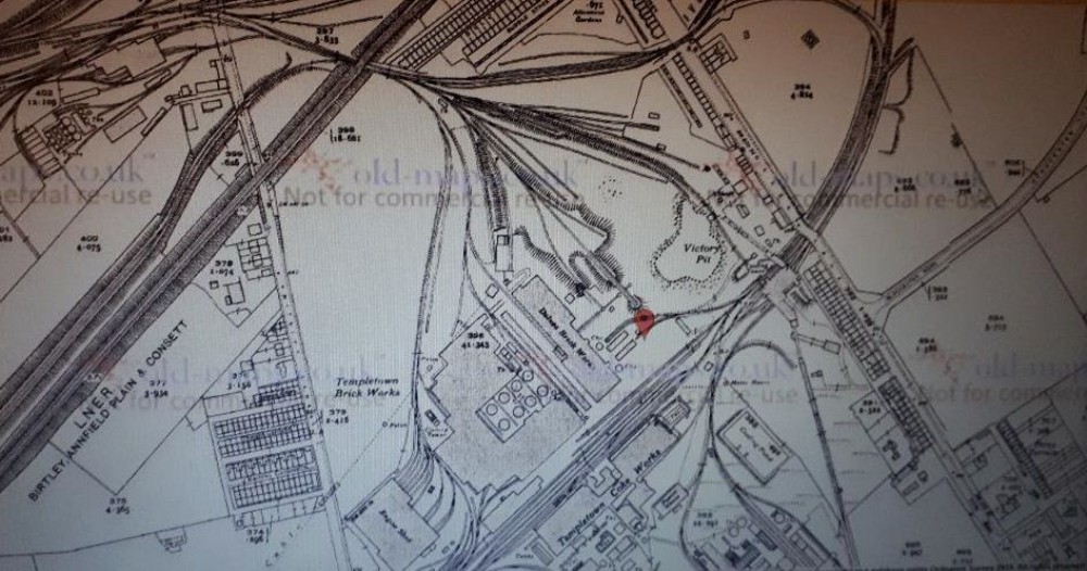 Now named Victory Pit, again appears more clay than coal produced judging by the expansion of the Brickworks, also large Coke Works plant and just below Tar making plant. The distinctive stone building on Delves Lane now shown. Other than the stone (workshop?) buildings very few other buildings are on this map, and only one shaft.