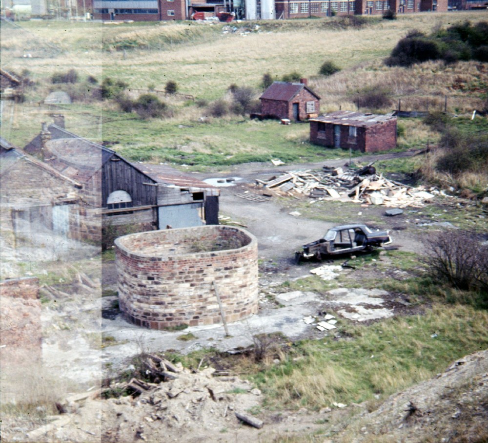 View from the tip down onto the main shaft with the modern factories in the background.