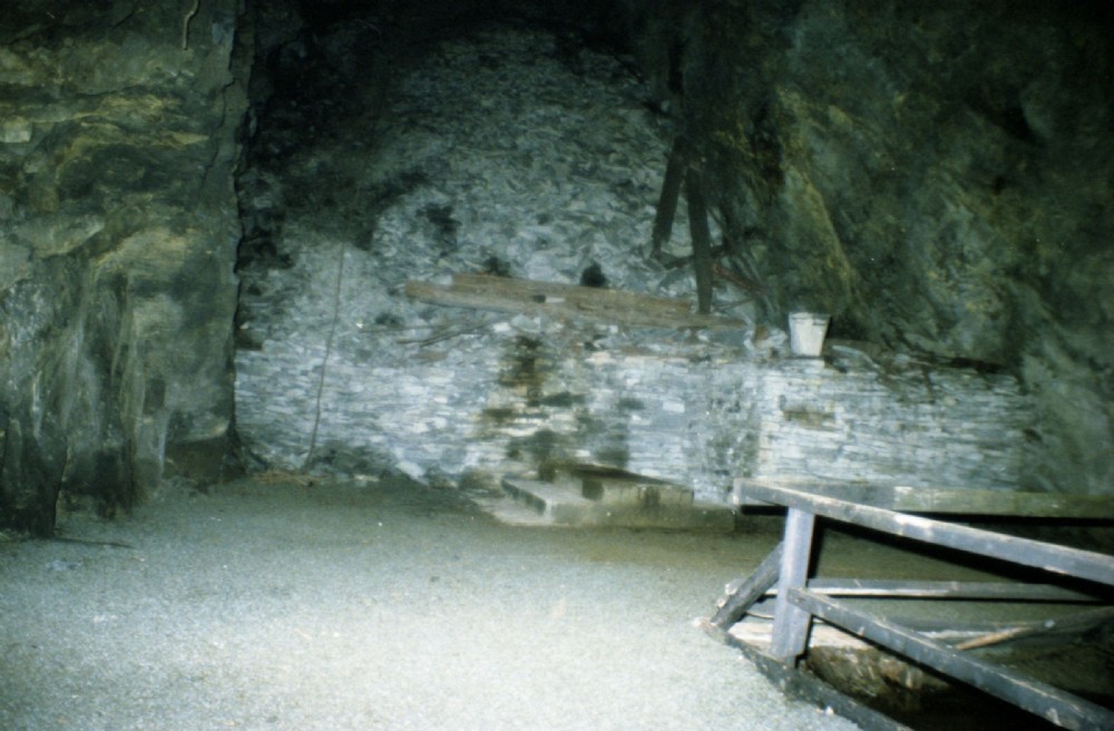 This chamber was the site of the Incline down to D floor. The railings in the foreground are round the flooded shaft. In front of the wall are the mounting blocks for the later winding gear. The remains of the floor B bridge timbers can be seen on the tip behind the low retaining wall.