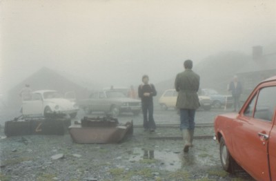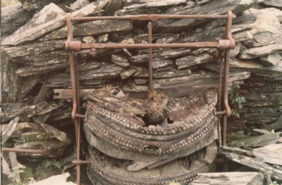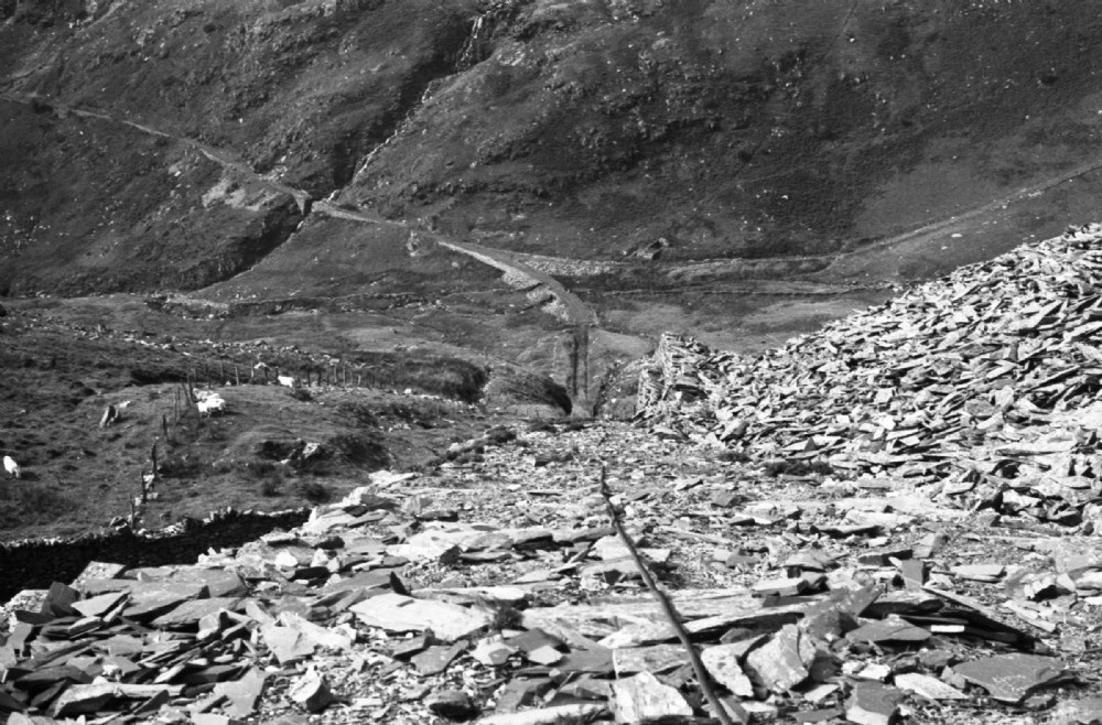 Looking down the main exit incline to the Croesor Tramway - the ruin at the bottom once held a turbine driven compressor for the drills used to drive the abortive inclined shaft whose head is now at the bottom of the tip.