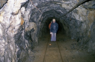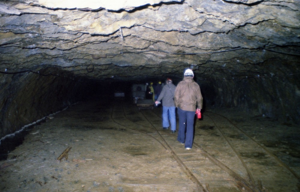 Our first view of arriving at the widened out section of the adit at the head of the main underground incline. This area was dubbed by us as "Baker Street" but more prosaically as "Passby." Here you can see the first tramway points, the Ruston Loco, and the draianage channel on the left taking the water from the pumps.
