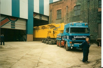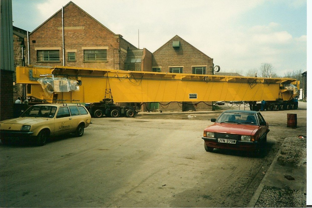 MASWEP crane girder leaving No.9 shop extension. Approx. 40m long and weighing 40t.