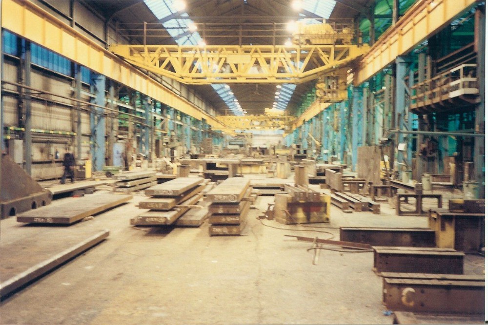 View from the bottom of No.9 shop looking up. Steel slabs in foreground are more parts for the foundation beams for Canary Wharf. The platform to the right held the generator for the "Hi-Cycle" grinders