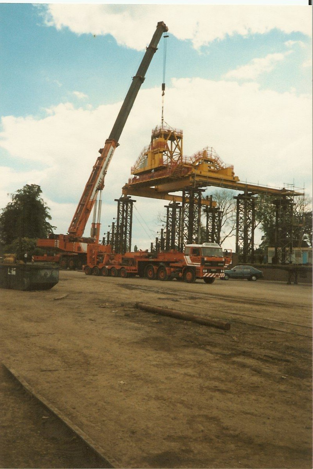 Another view of the trolley for the rack handler being added to the trial erection in the car park