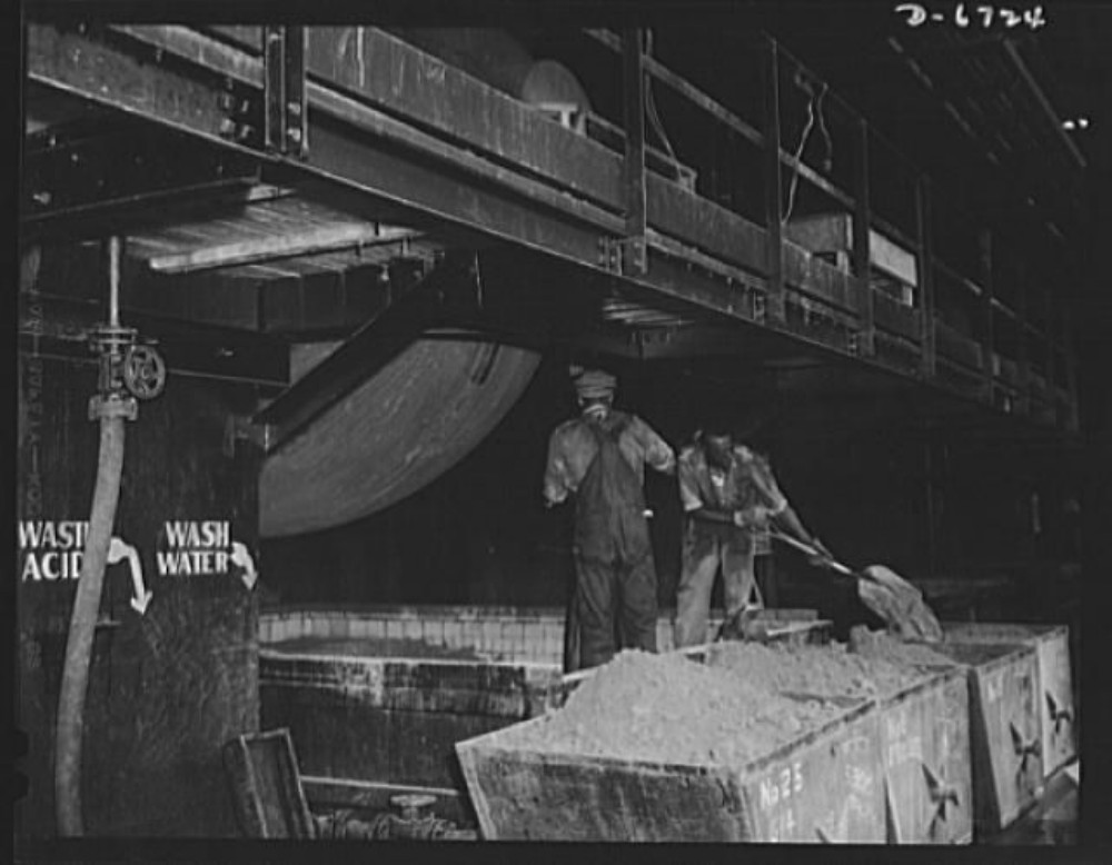 Workers at a Southern tin smelter removing ore from the leaching and bleaching processes and loading it in cars for the furnace. The raw ore comes to the plant in bags, direct from the South American mines and passes through a series of processes that result in the extraction of pure tin which serves countless war purposes of the United Nations