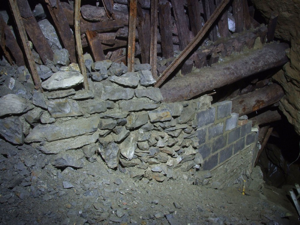 Rails have been wedged at the top behind a timber and concreted in at the bottom to retain deadwork where the original timbers have rotted. Packwall will be extended down to cover blockwork. The jack has now been removed.