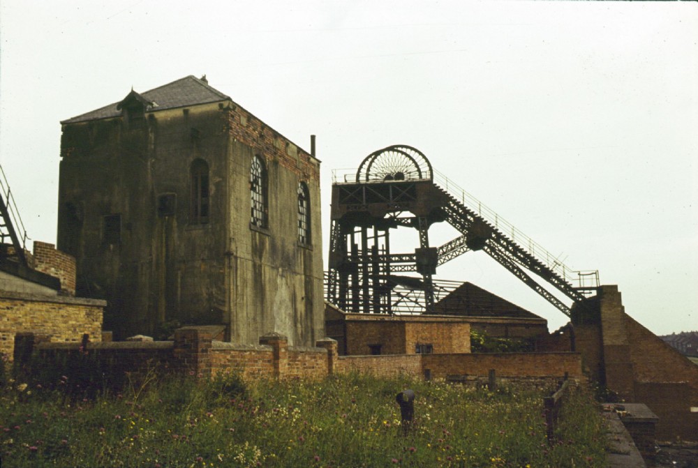 The vertical steam winder went out of use but was preserved in situ until about 1979 when it was swept away. Note the unusual angled headgear.