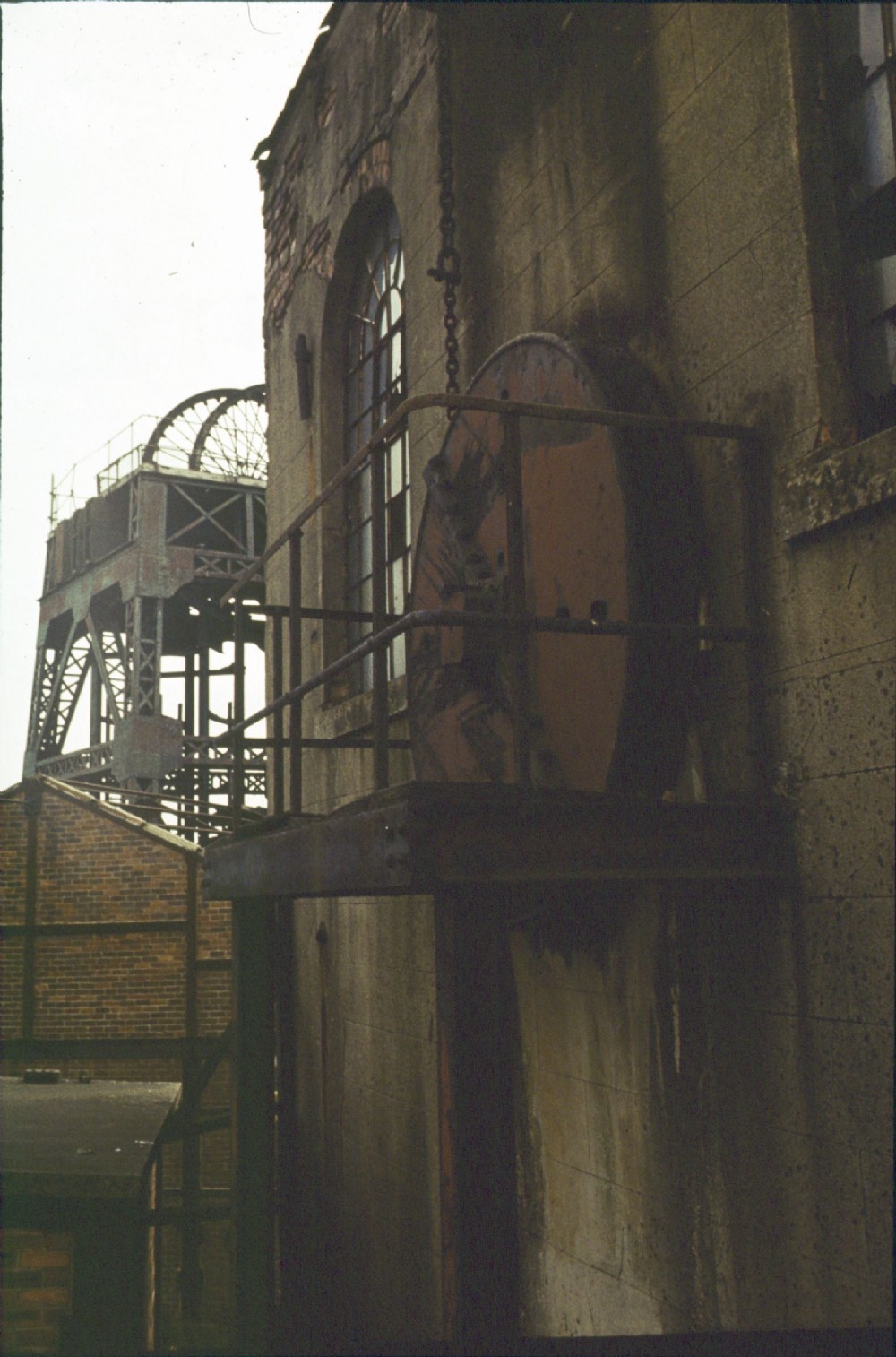 Close-up of the counter-balance drum on the exterior of the winding house.