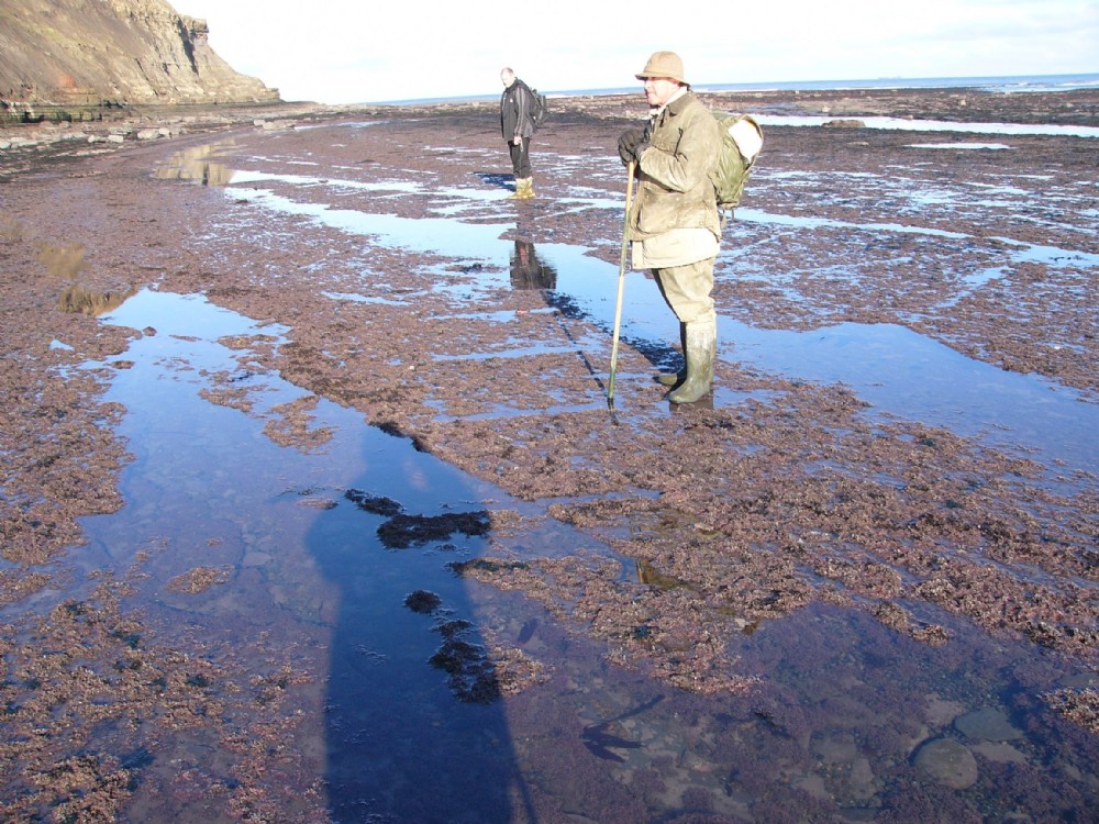 The bottom of John's staff marks the imprint of a sleeper with others beyond to where Dave is standing. Part of a foreshore tramway from quarry to drift.