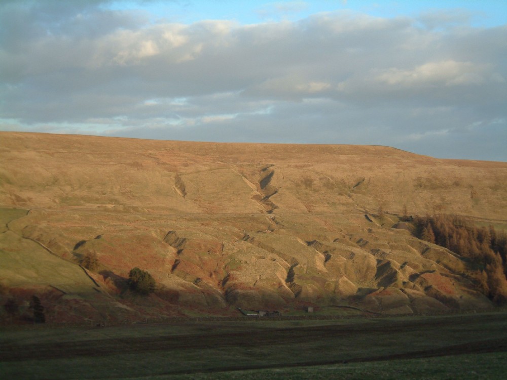 The setting sun reveals either High Skears Mine tailings or hushing. Seen from Coldberry