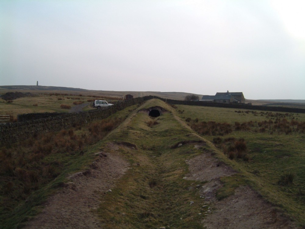 Allendale appeared to have 2 lead smelters each with a long flue leading to a vertical chimney on high ground as it was found that more lead could be scraped from the roof of the flue than was produced in the smelter. Young boys of around 10 years old were employed to do the scraping. Life expectancy was 3 to 4 years before they died of lead poisoning. The 2 flues crossed over each other on the way up the hillside. Here we are looking along the top of one flue with the chimney of the other flue on the hilltop. The chimney for this flue has collapsed