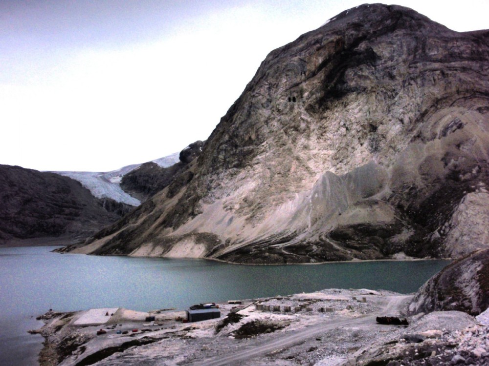 BA campsite and portals in back ground. Note the actual "black angel" in the dark pelite rock onthe cliff face. The four black spots are the portals for the cable cars that used to run from the campsite. To the right of were i was standing -out of shot- is the portal for the Nunngarut district. The blob in the lower RHD corner of the photos is a Wagner ST2 scooptram.