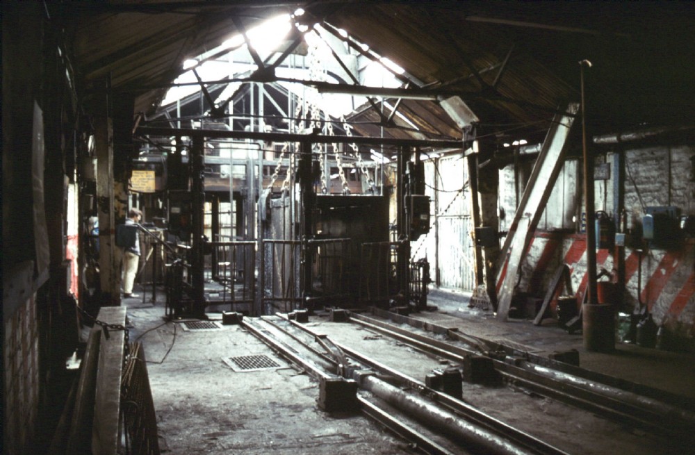 Cage at bank. Rams between rails for power loading trams into it.