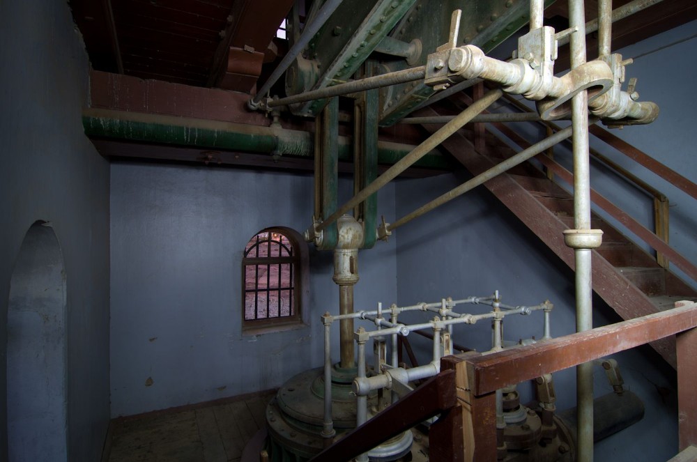 View of the middle chamber of the engine house showing the top of the cylinder and the valve gear