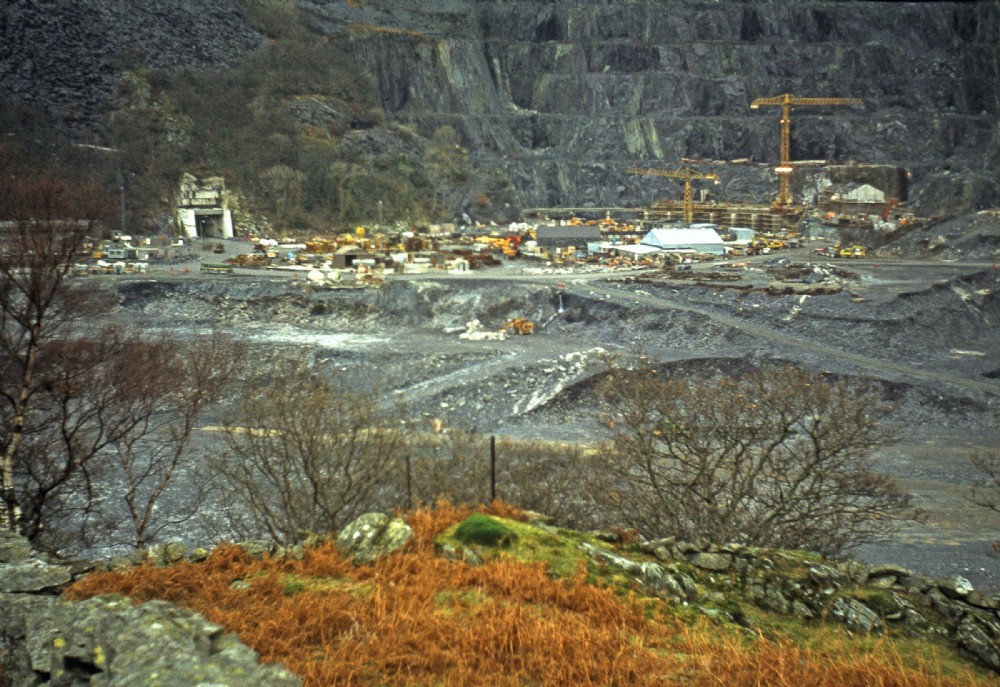 View across the drained Llyn Peris to the construction site with the power station entrance on the left and the water inlet/outlet on the right.