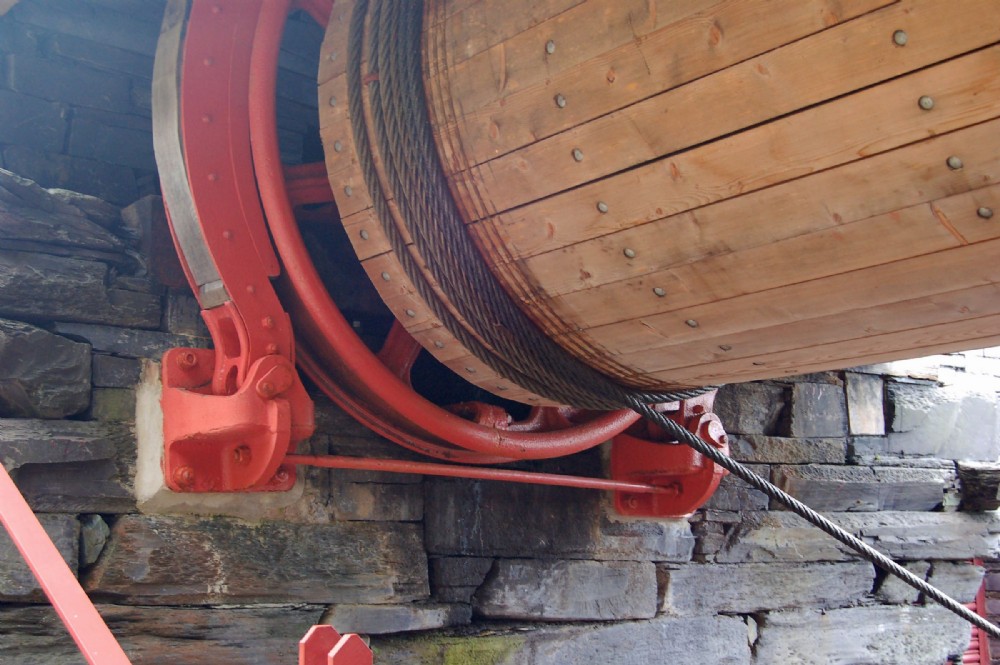 View of the caliper brake. Braking arrangements differ from drumhouse to drumhouse this caliper is not typical of the Vivian Quarry. The rest of the brake mechanism is out of sight (and photography) in the brakemans cabin at the side of the drumhouse.