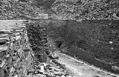 A view of the water balance site from the western side. The tall pillar once carried the launder from the A mill wheel discharge to feed the B mill wheel.