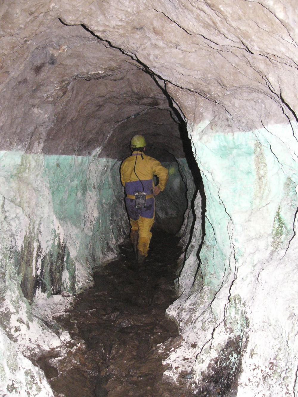 Mountain mine adit level. This level must have been partly flooded at one time and green copper stains can be seen on the walls