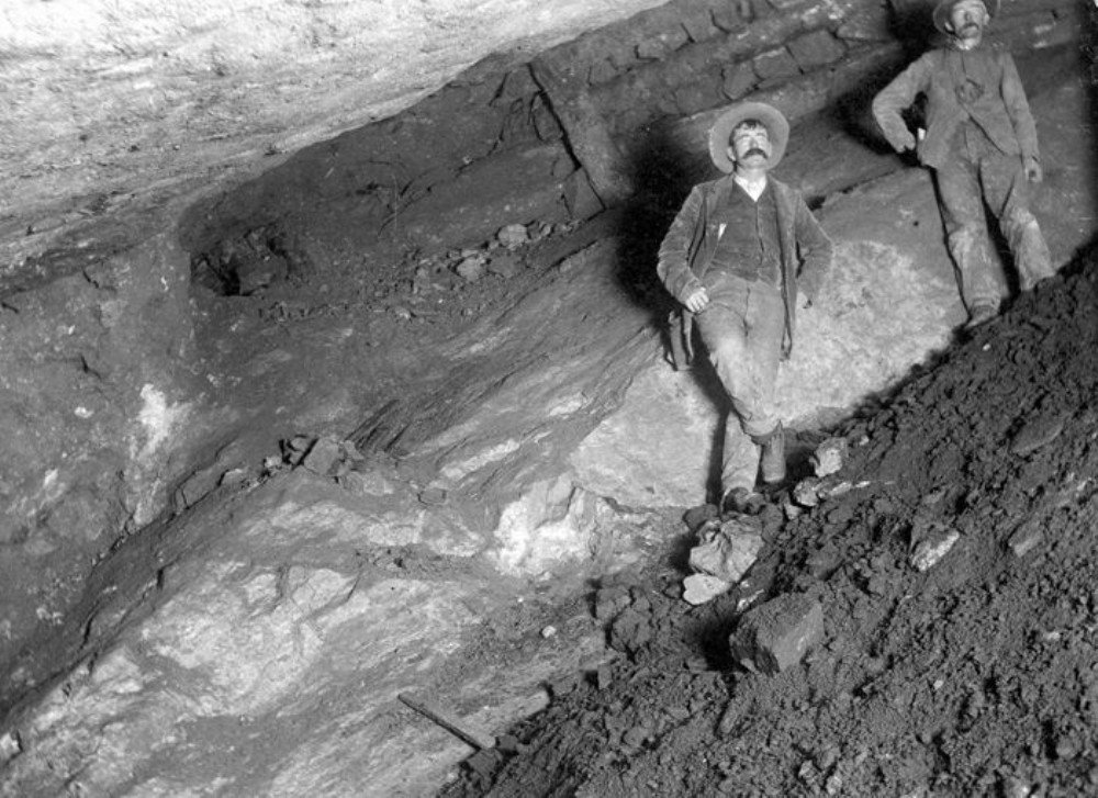 A flash-light view in Black Hawk Mine. Stoping out and timbering a flat vein. Rico quadrangle. Dolores County, Colorado. 1896.