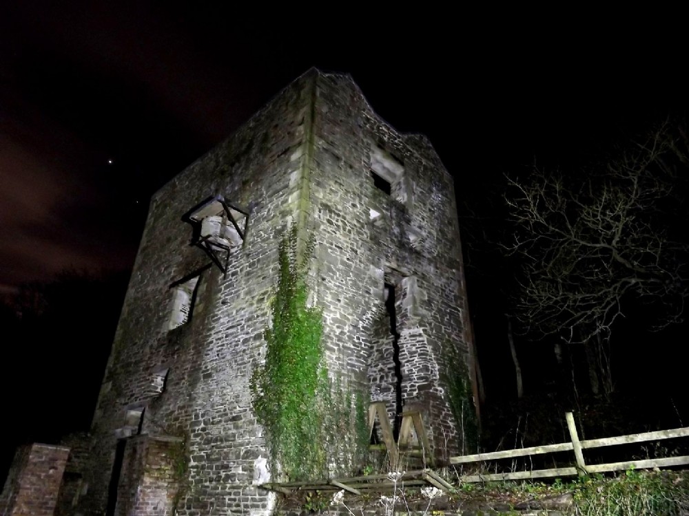 View of the engine house at Snailbeach taken and night with the engine house light painted.