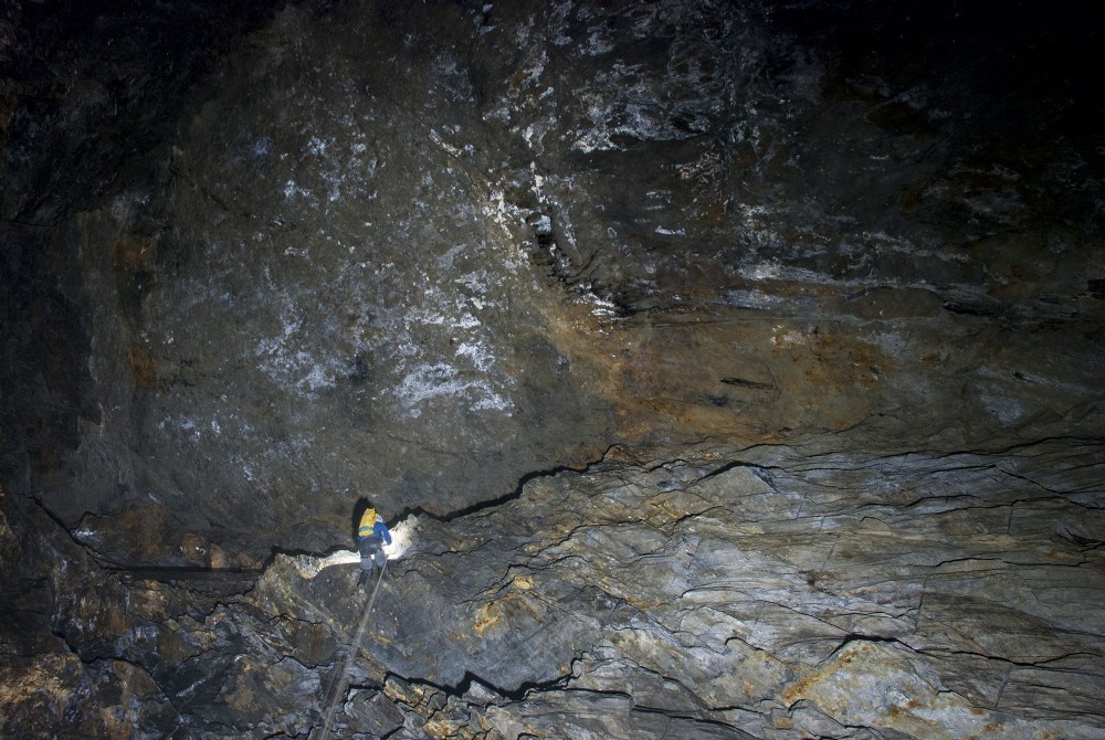 Abseiling the final chamber in level 16 down to level 17. The roof isn't in an encouraging condition.
