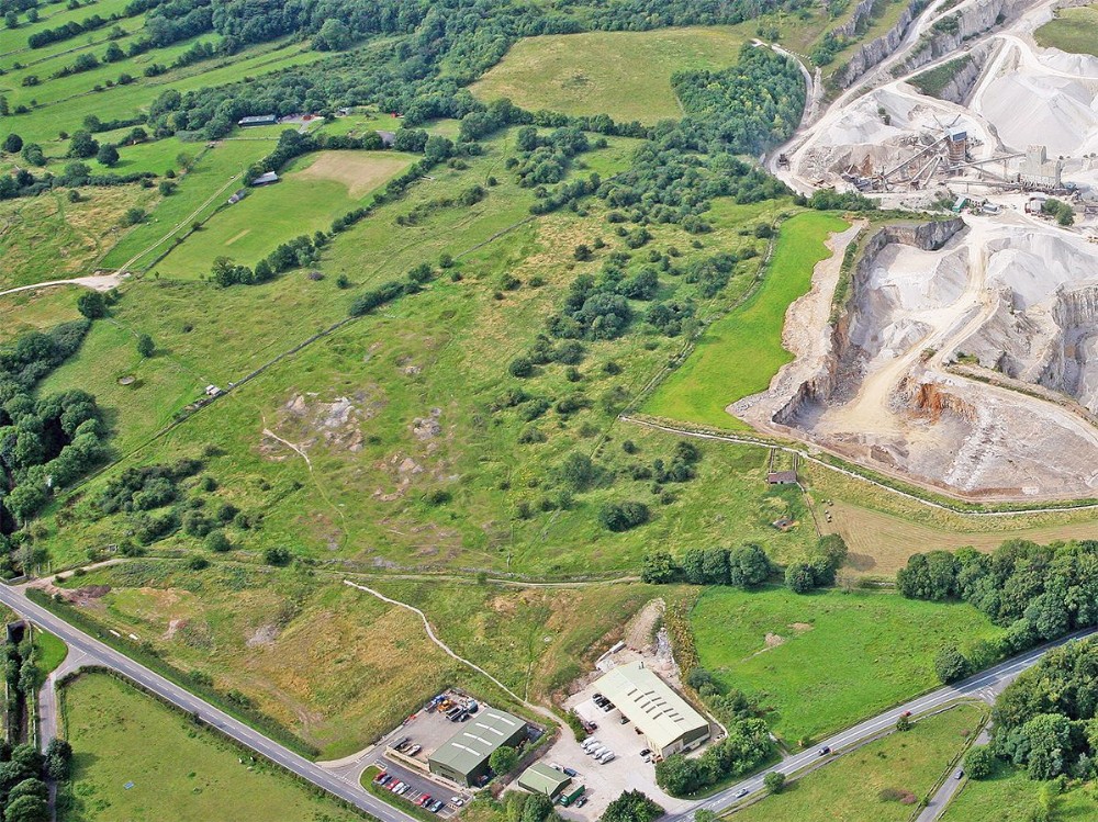 The surface remains of these important mines are rather disappointing and have been slowly obliterated over the years, particularly recently with the building of two new depots (bottom). The shafts and hillocks are on the hillside, left of centre. Modern Dene Quarry (part of) to the right. Killers Branch of the old High Peak Railway is in the cutting, bottom left
