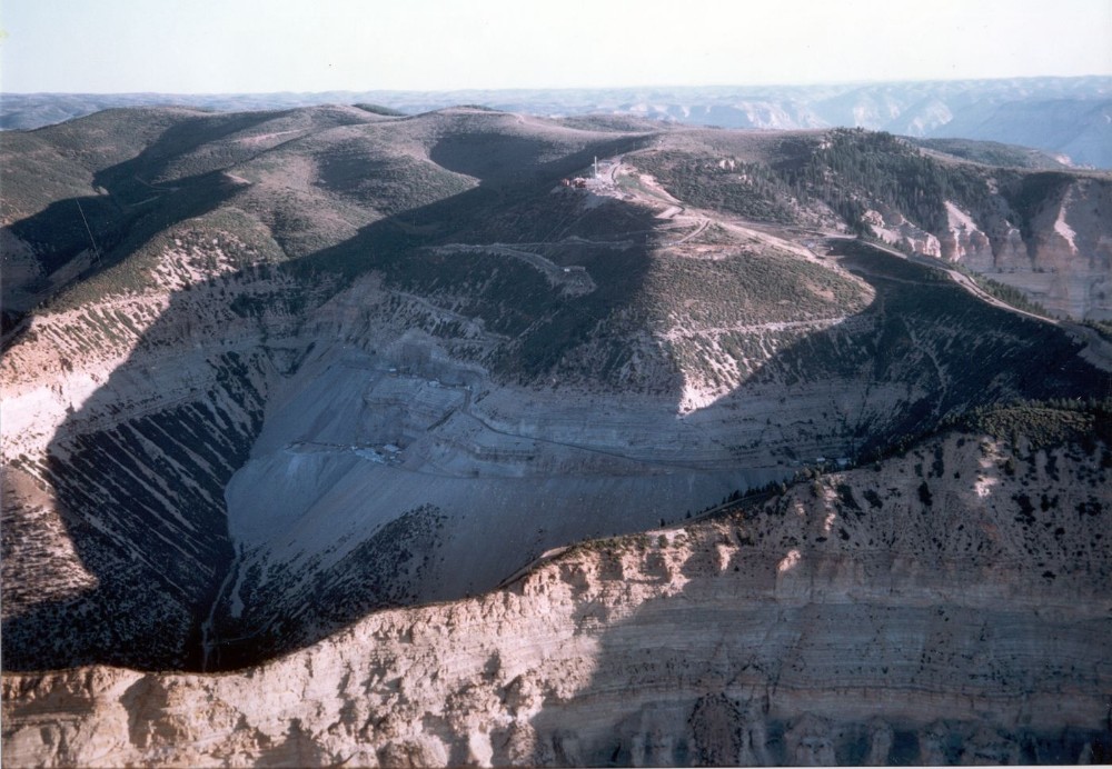 Aerial view of Occidental's Logan Wash mine site. Upper and lower benches in left center. Gas processing facilities on ridge above. Garfield County, Colorado. August 27, 1981.