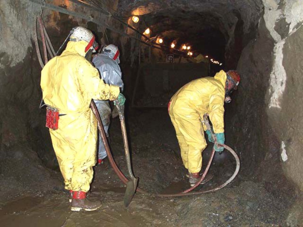 After sediments are removed, the remaining fine material is pressure-washed farther down tunnel.