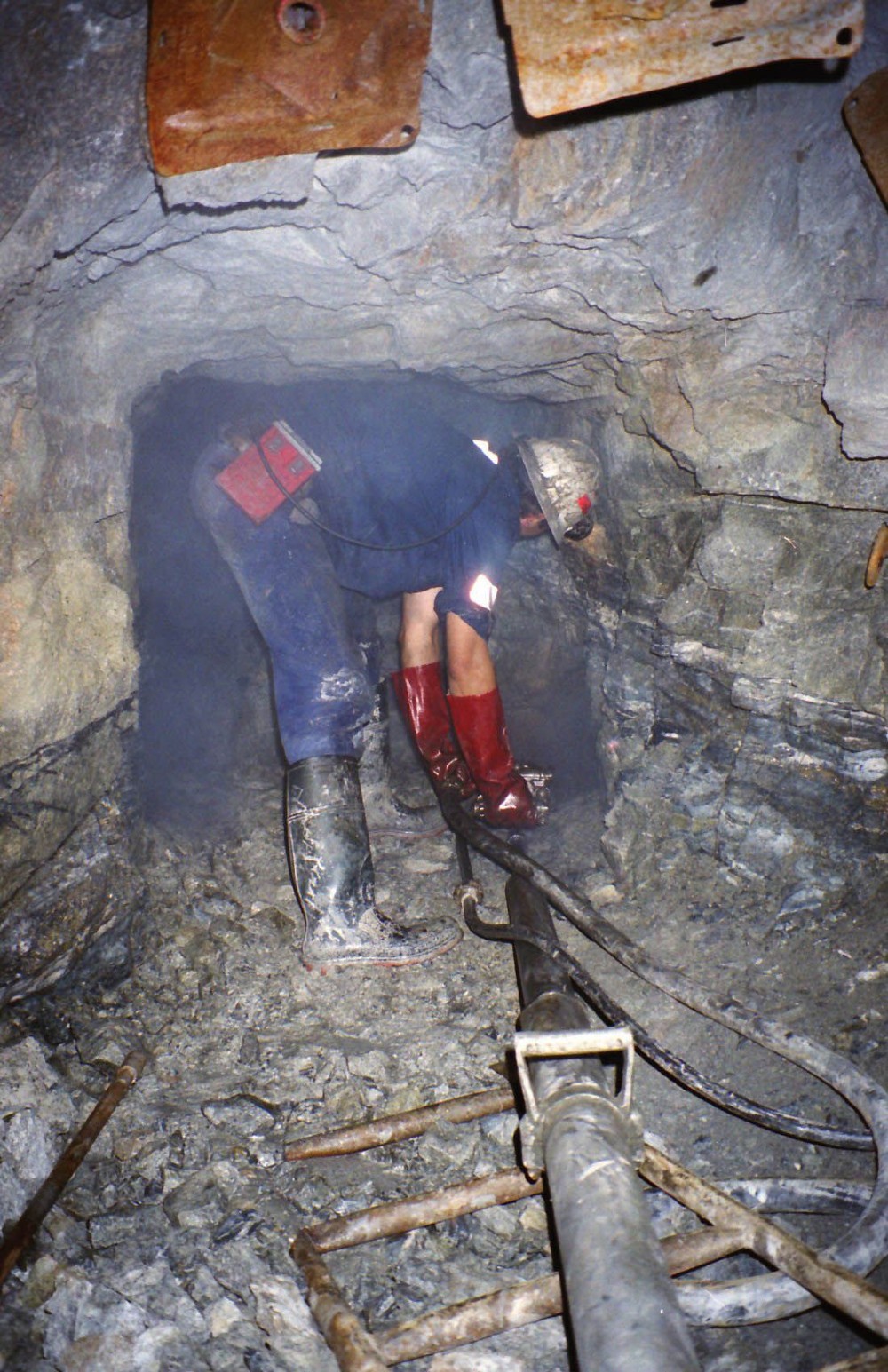 An air-leg miner rising on a gold bearing quartz lode which is visible in the lower half of the rise. This is probably above 2 level on one of the shallow-dipping hanging wall lodes.