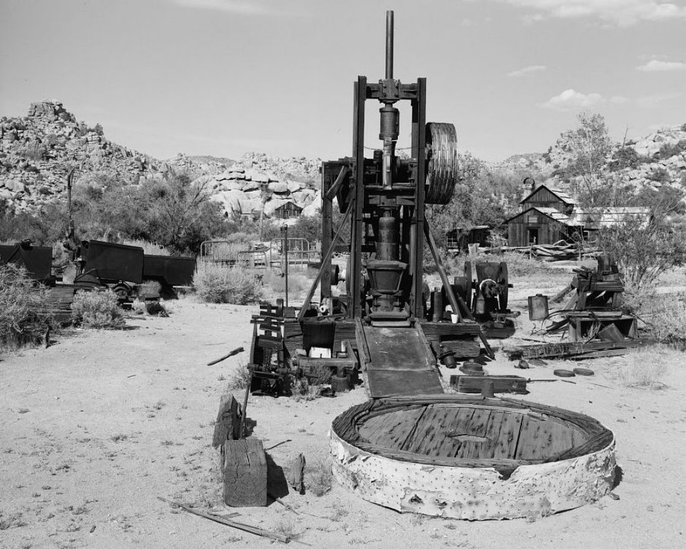 VIEW OF ONE-STAMP MILL WITH RANCH HOUSE AT REAR (See HABS No. CA-2347, DESERT QUEEN RANCH, for further documentation)