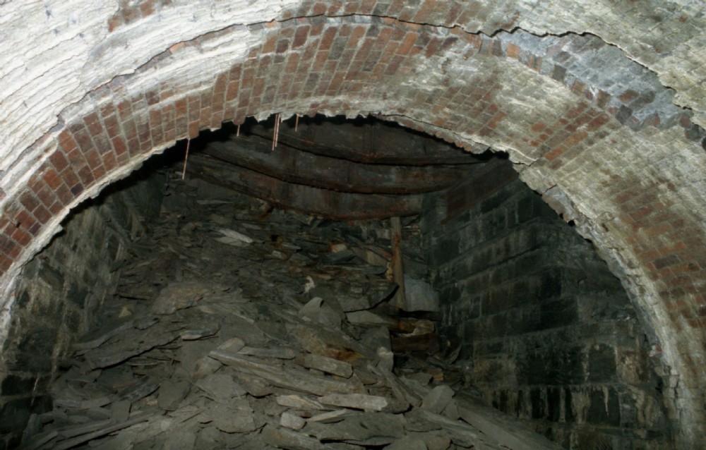 This was the end of the level - you can see the original brickwork and the later masonry, with the girders overhead to support the incline.