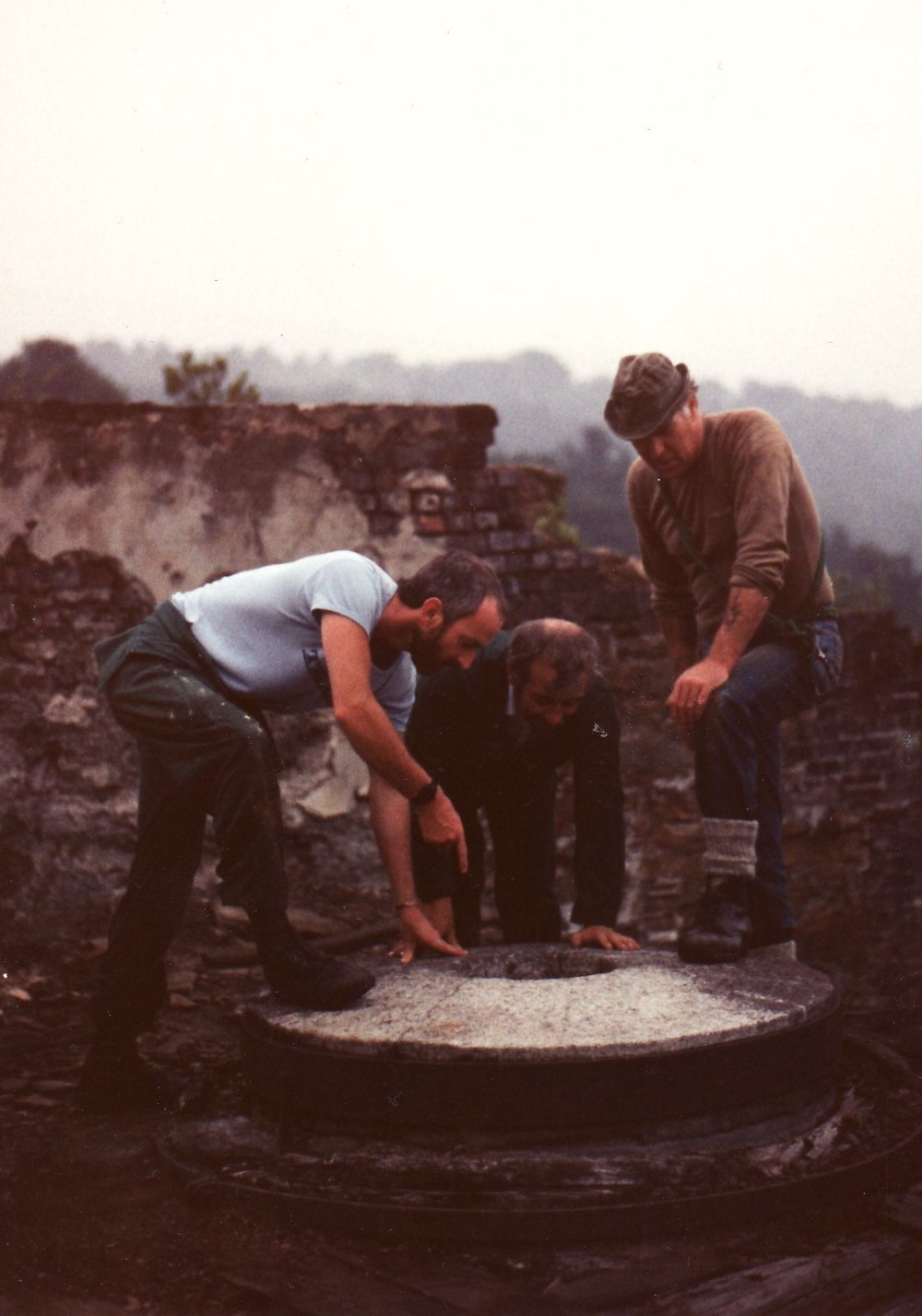 The grindstone of DGC's arsenic mill, left to right -Steve Wadlan, G.C, Alan Tomlin. 1989
