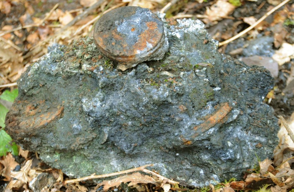Metal objects embedded in concrete like substance (possibly burnt) found in pit area behind bomb store.