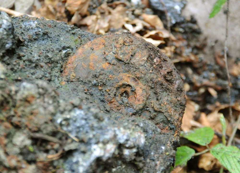 Metal objects embedded in concrete like substance (possibly burnt) found in pit area behind bomb store.