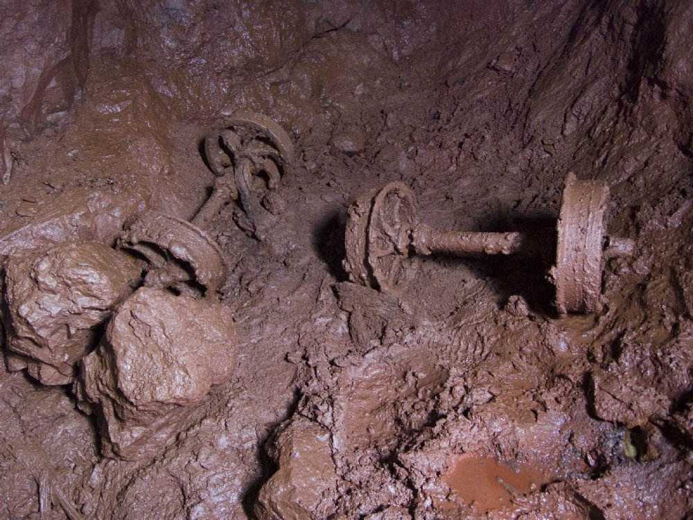 A pair of axles, given the 1' track gauge seen eleswhere in the mine it is clear that there were at least two different track gauges used underground.