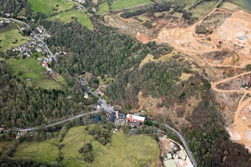 Aerial of Via Gellia showing Ball Eye mine entrance (to the right of the red building) and the quarry behind. The Pig of Lead pub (now not a pub!) is visible at the fork of the road up to Bonsall