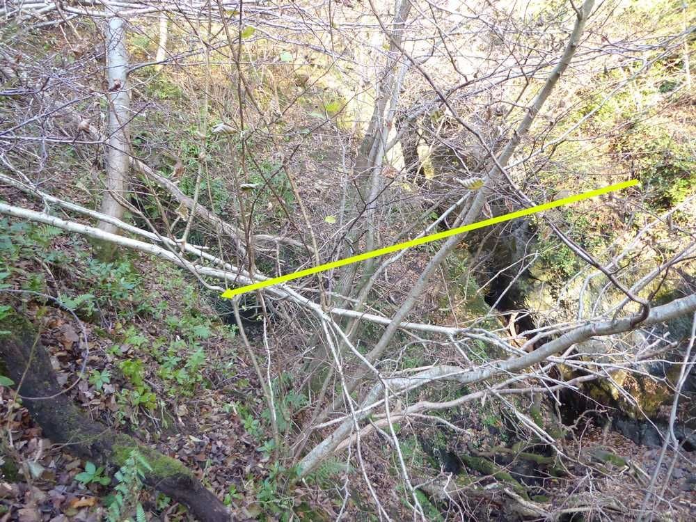 Mine entrance marked with arrow. Rocky gorge can be seen starting in background.