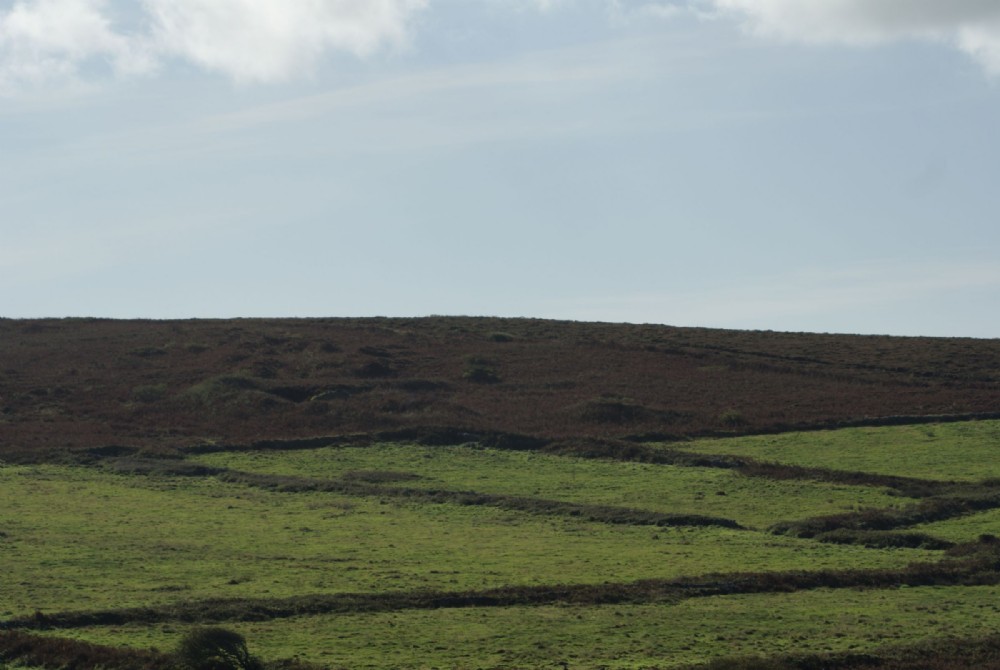 Photo shows Bartinney Downs as it is in 2009. The adit began in the hedge at the bottom right of the picture. Water still issues. The opencast pits run up the hill. The lower shaft is just into the roughage on the right over the hedge and the upper shaft near the top of the hill.