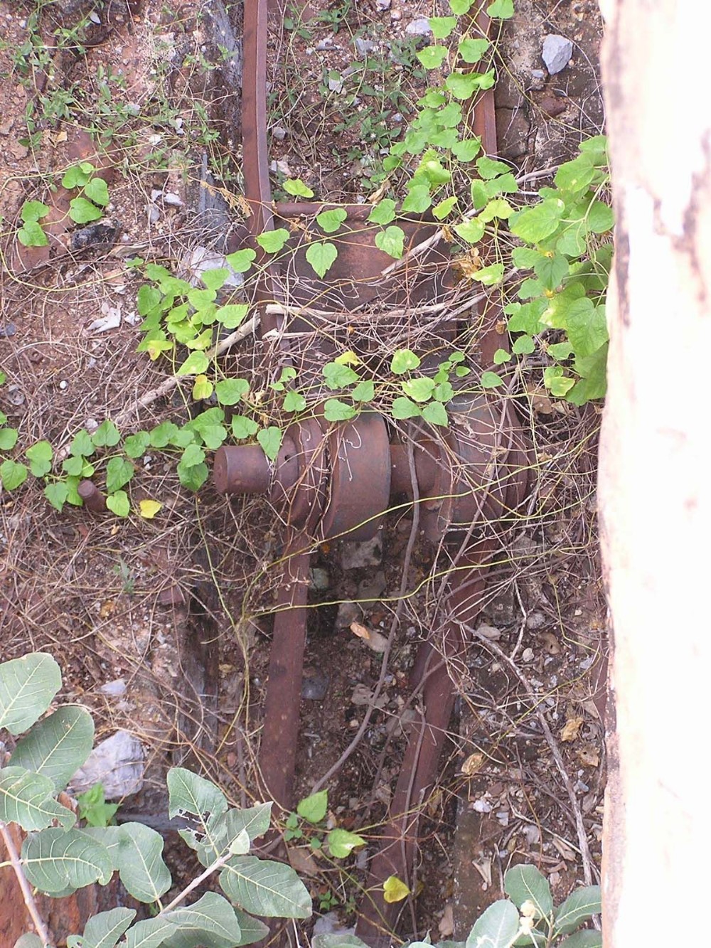 What looks like the axle or central portion of the beam pump or perhaps part of the drive mechanism. It has been heavily scavenged for scrap steel at some time in the past.