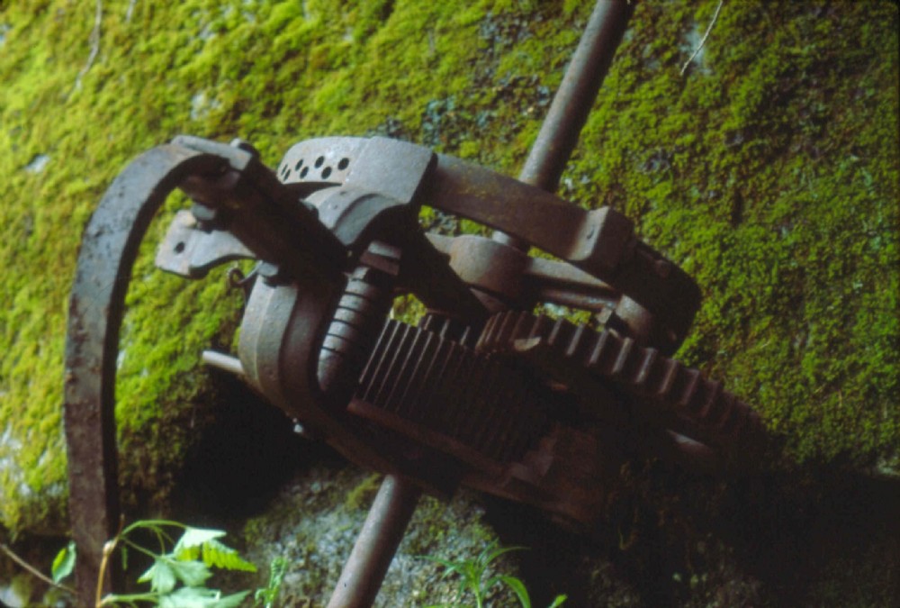 Saw mill machinery near camp building in basin above mill - photo 1982.