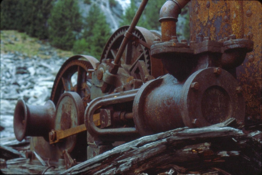 Steam donkey in basin below adits 6 & 7. Photo October 1982.