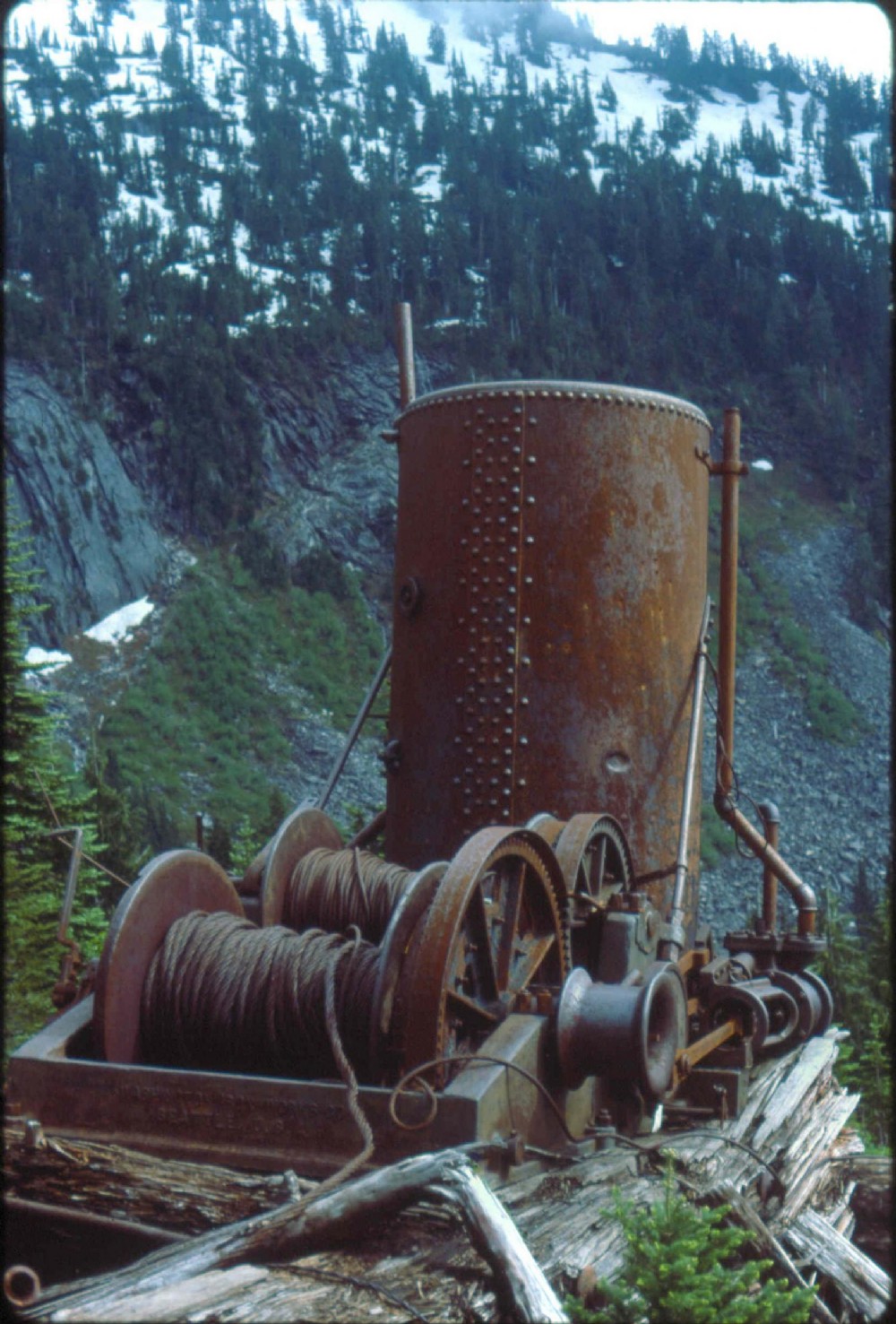 Steam donkey in basin below adits 6 & 7. Photo October 1982.